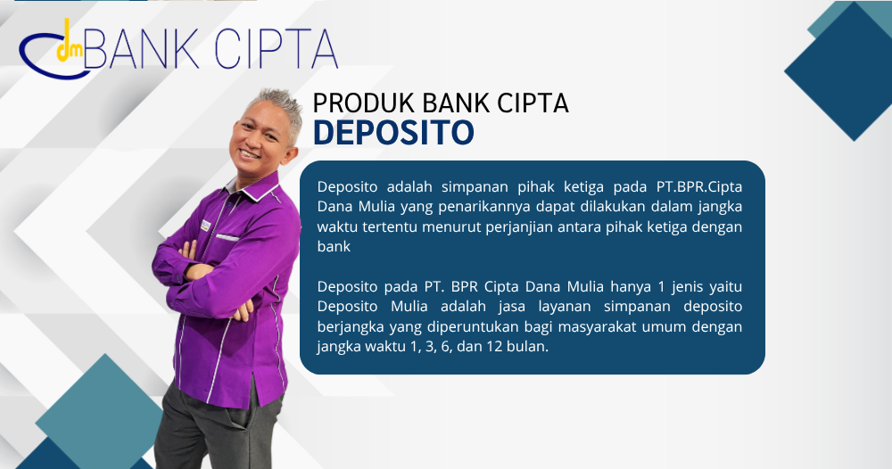 Deposito pada PT. BPR Cipta Dana Mulia hanya 1 jenis yaitu Deposito Mulia adalah jasa layanan simpanan deposito berjangka yang diperuntukan bagi masyarakat umum dengan jangka waktu 1, 3, 6, dan 12 bulan.